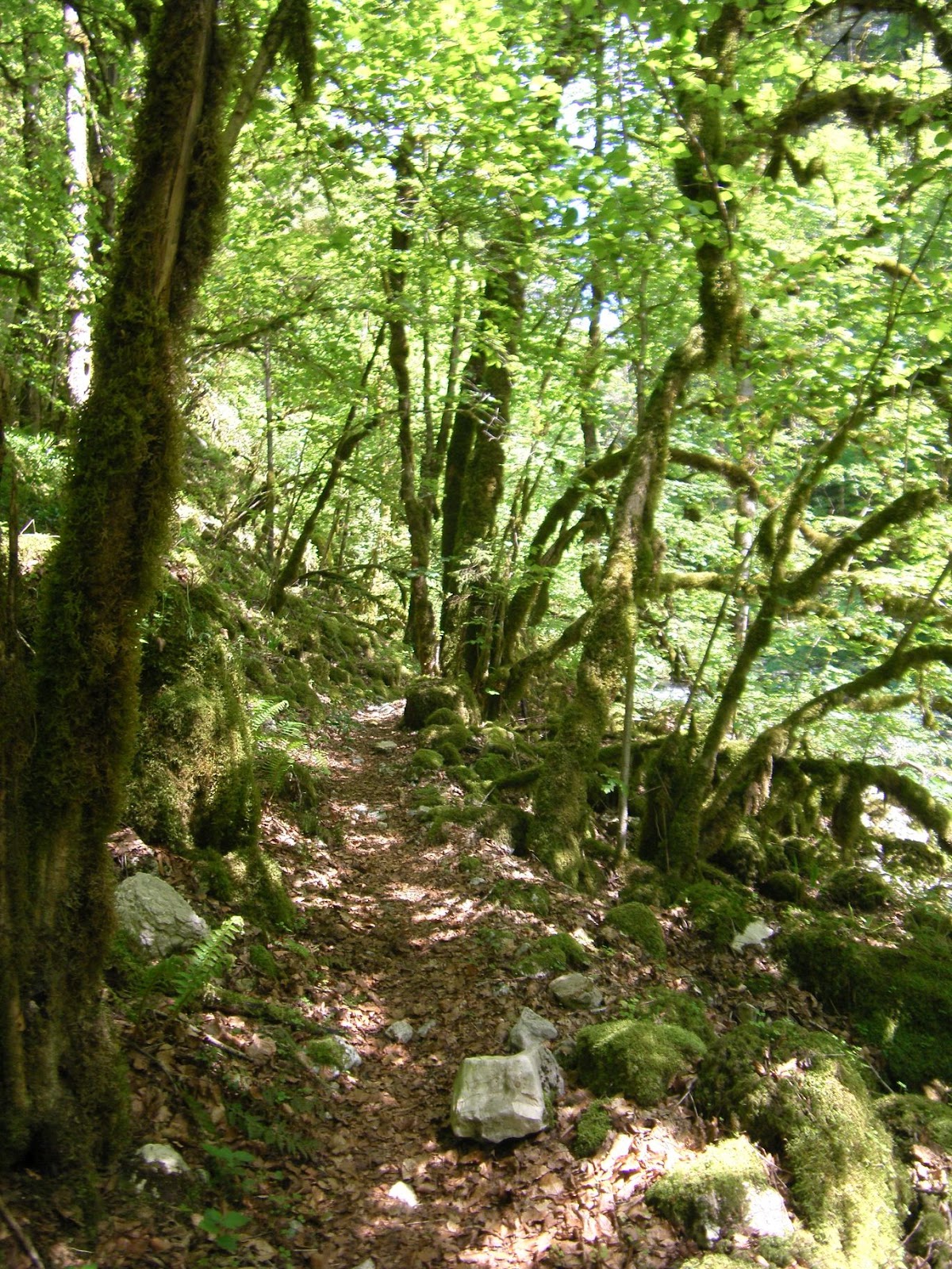 Eine halbe Stunde weiter teilt sich der Weg unvermittelt -- der "große" Wanderweg biegt plötzlich in Richtung bergauf ab. Ein Schild löst meine Irritation, es gibt eine neue Wegführung wegen Sicherheit und so. Laut drauf gelacht, ich nehme natürlich die alte Route unten am Fluß. Ich wäre schön blöd, jetzt 400 Höhenmeter auszusteigen, nur um dieselben 400 Höhenmeter ungefähr 10 Flußbiegungen weiter wieder abzusteigen. Und meine Eigensinnigkeit wird belohnt: Man merkt dem Weg an, daß er nicht mehr begangen wird. Überall erobert sich der Wald und das Unterholz seinen Platz zurück. die Brennnesseln drücken den ohnehin schmalen Pfad weiter zusammen und peitschen den Wanderer, umgestürzte Bäume bleiben einfach auf dem Weg liegen. Das ist natürlich das Paradies für mich...